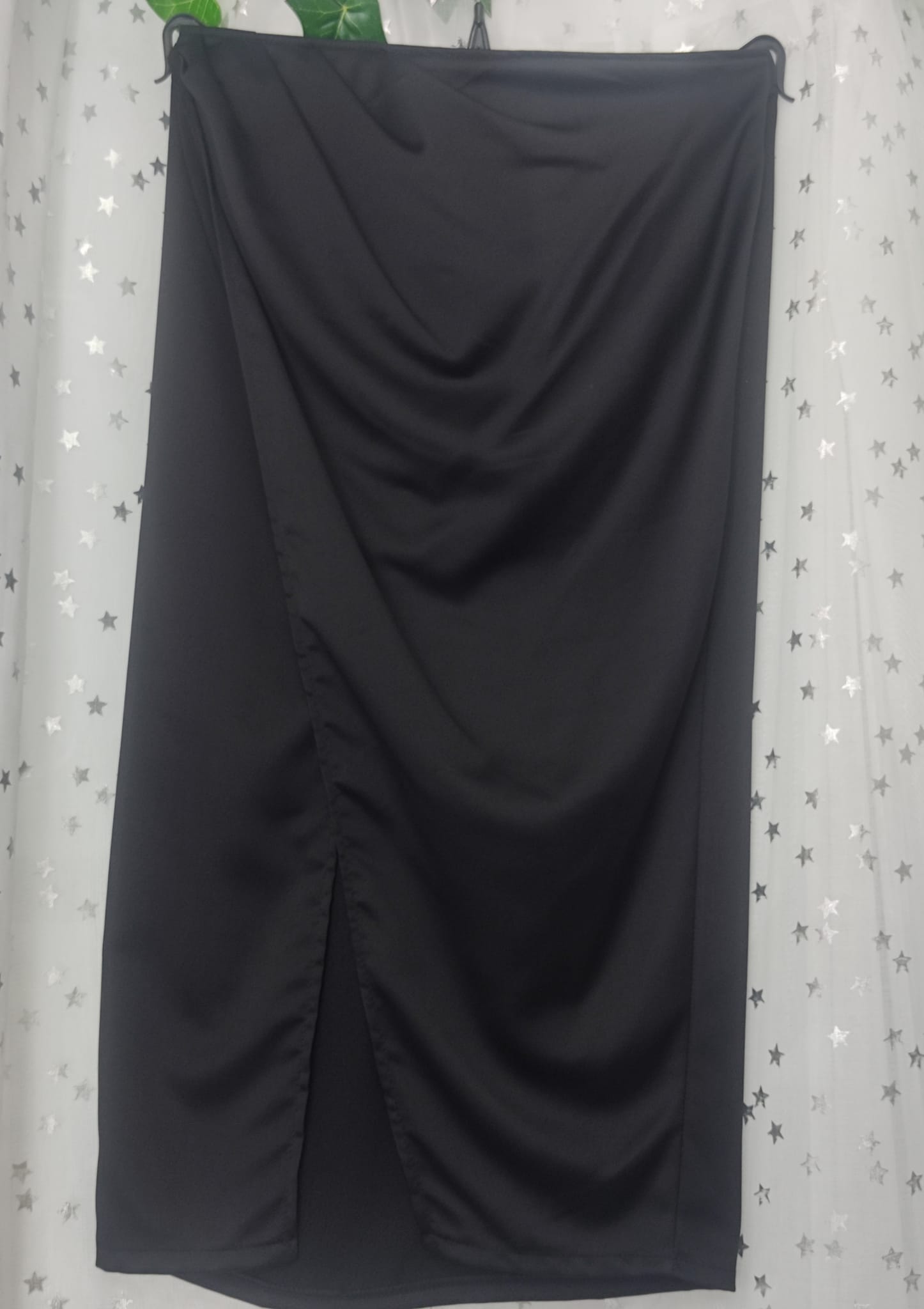 Elegante falda de satén con gomilla trasera y con abertura lateral. Talla única (hasta talla 44).
