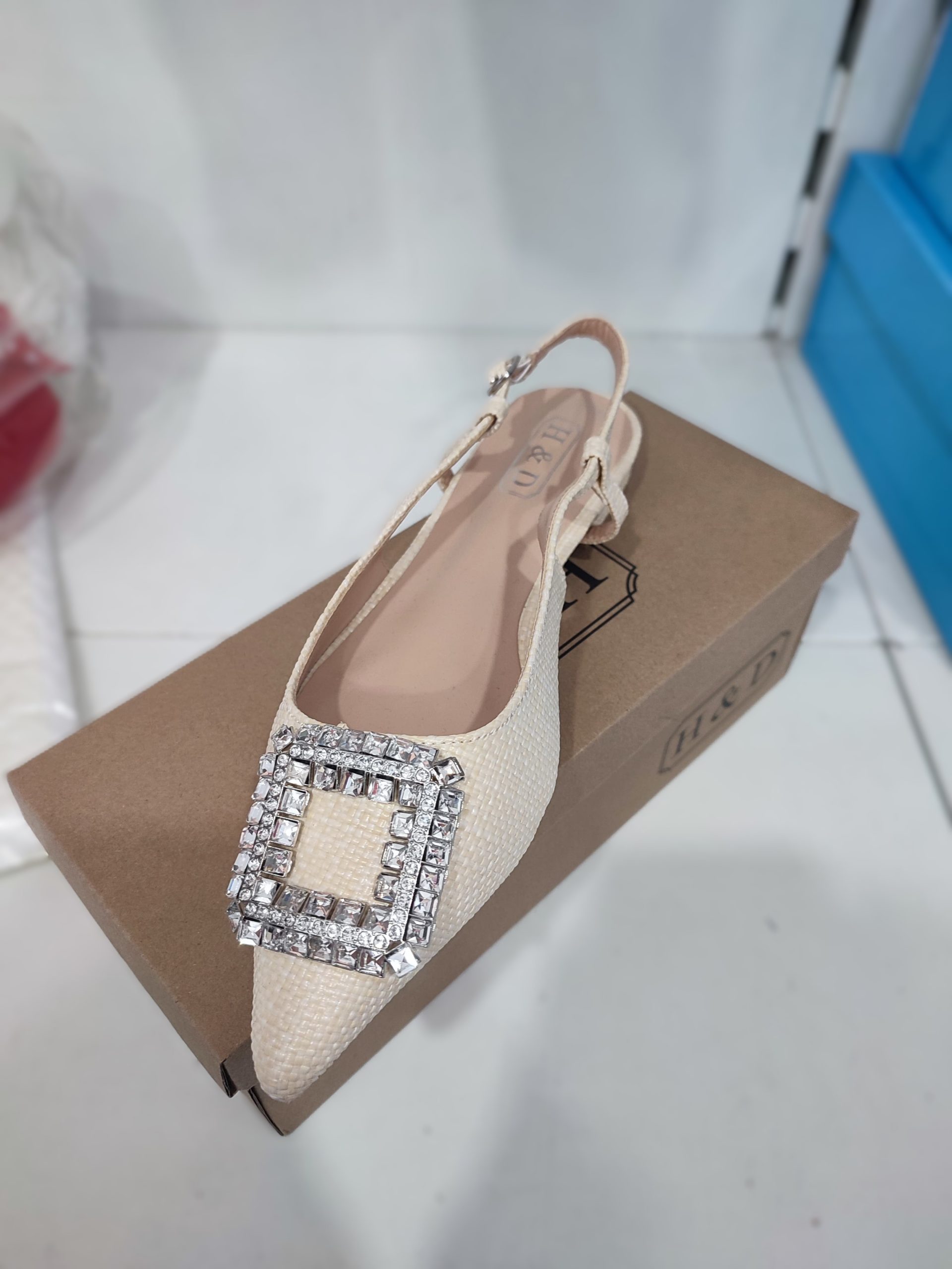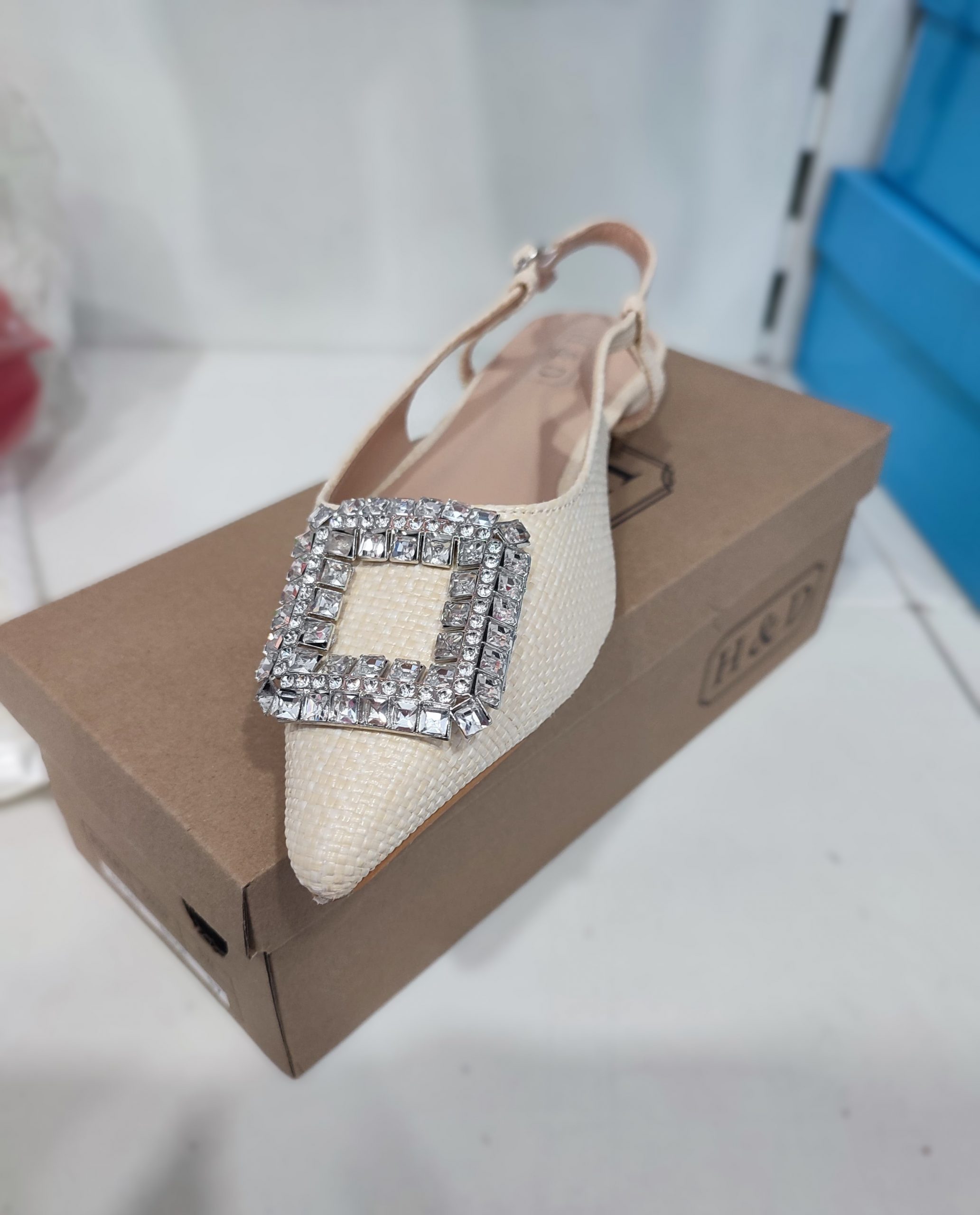 Zapato bajo en color beige con correa en el talón. Punta en pico y elegante broche de brillantes en la parte frontal. Ideal para llevar zapatos elegantes a una celebración sin renunciar a la comodidad de los zapatos planos.
